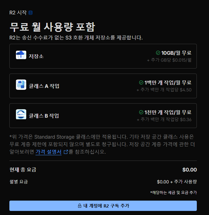 14. 두 번째 업그레이드 버튼 클릭하면 R2 구매 페이지로 연결됨 ( 제일 하위 플랜으로서 '무료' 가 있기 때문에 추가 결제 되지는 않음 )