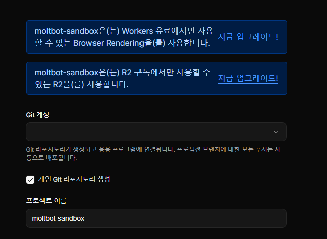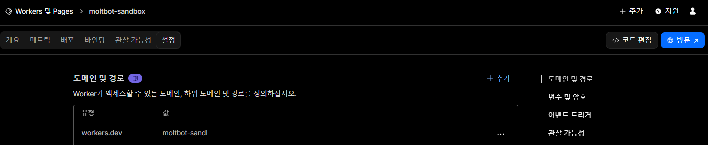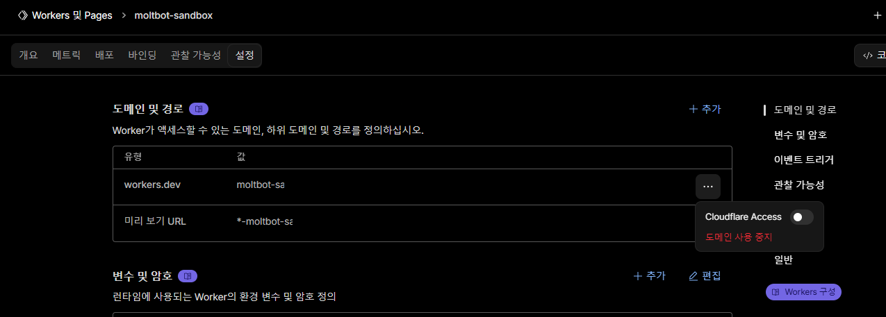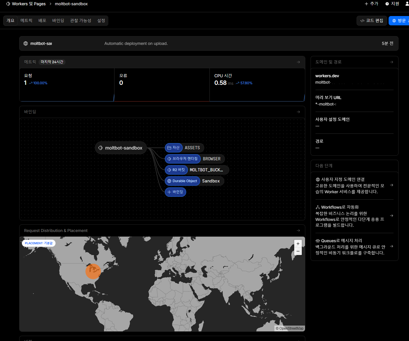 - 아래 사진 보면 "moltbot-sand~~~" 라는 문자열이 보일텐데 이게 몰트워커의 페이지 도메인 값 ( 메모 필요 )