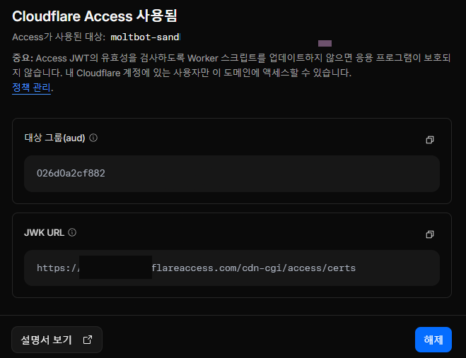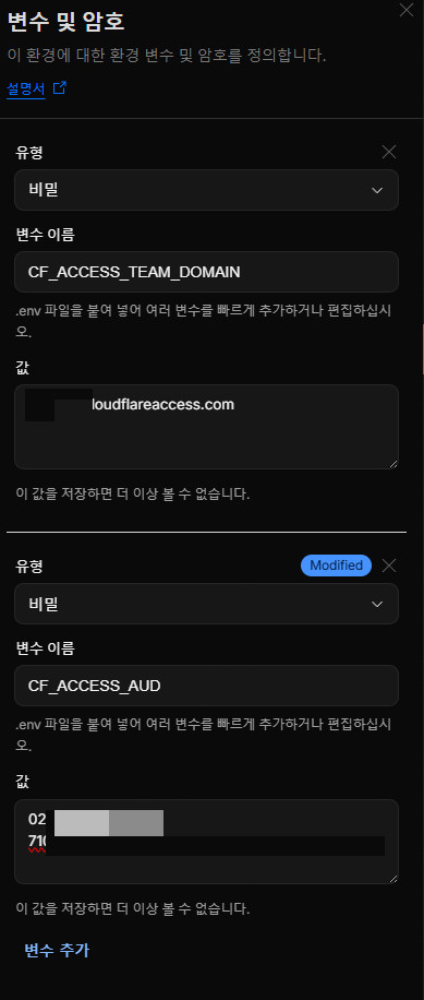 - 18 단계에서 메모한 "대상 그룹(aud)" 값은 "CF_ACCESS_AUD" 이름으로 설정