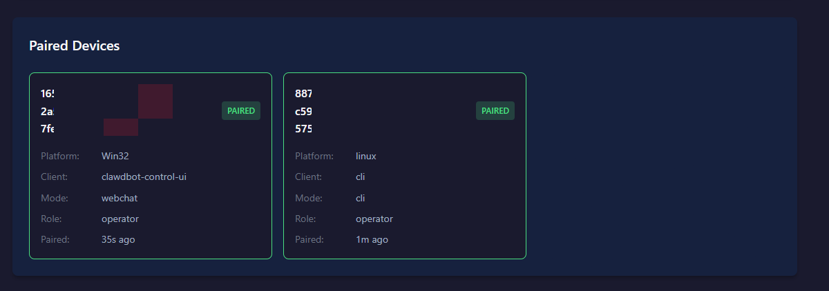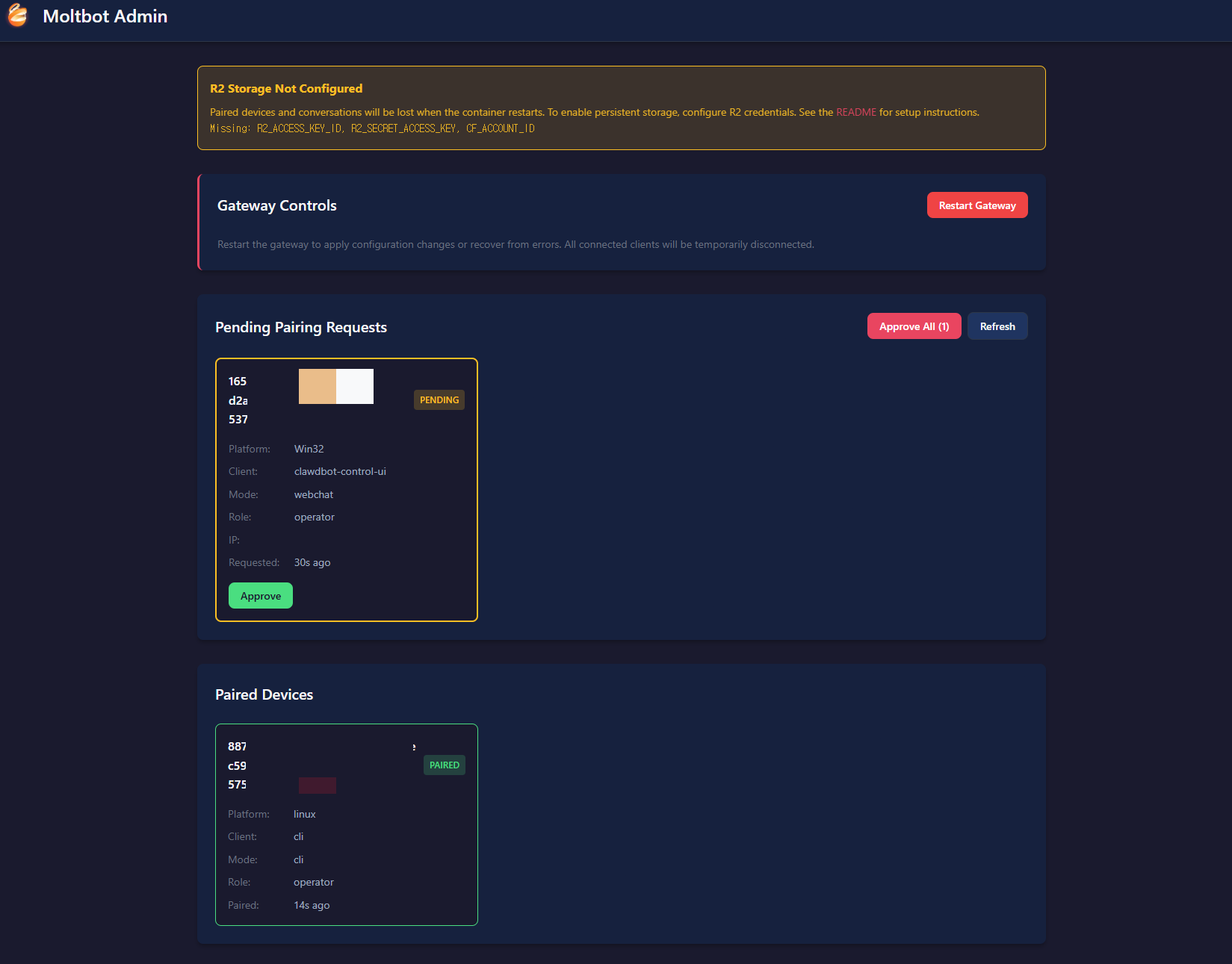 - 하단의 "Paired Devices" 에는 이미 디바이스가 하나 있는데 몰트봇 배포 중 클라우드플레어에서 자동으로 추가한 부분
