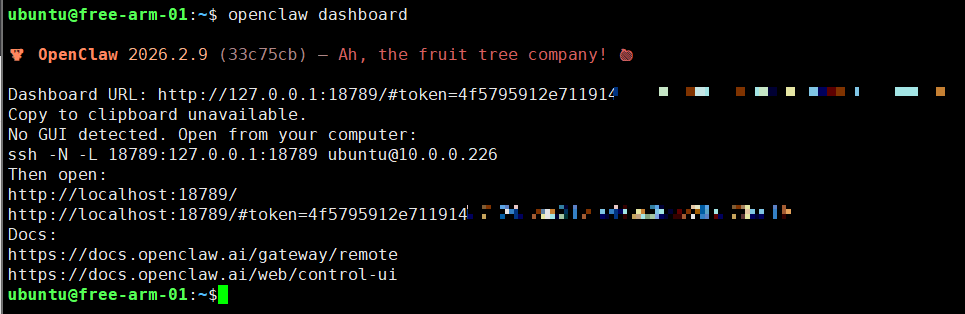 온보딩 과정을 진행하다 보면 마지막에 'bot' 선택 후 여러가지 정보가 출력되는데 스크롤을 조금 올리면 Control UI 섹션이 나오게 된다.거기 나와 있는 Web UI (with token)을 브라우저에 입력하면 오픈클로 대시보드에 접근할 수 있게 된다.