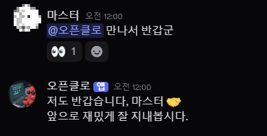 봇이 성공적으로 추가 되면 디스코드 서버에 "착륙" 메시지가 나타난다.