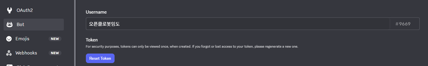 "Bot" 메뉴에서 "Reset Token"을 눌러 토큰을 재발급 후 나오는 값을 반드시 메모한다.