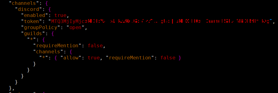설정 파일이 보통 "~/.openclaw/openclaw.json"에 있을텐데 아래처럼 디스코드 부분을 수정하면 된다.