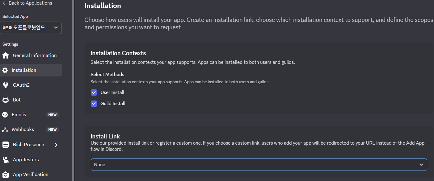 그러면 앱의 페이지로 이동되는데 "Installation" 메뉴에 들어가서 "Install Link"을 "None"으로 바꾼다.