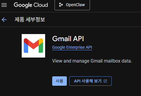 gmail 검색 후 선택하면 세부정보 화면이 나타나는데 저기서 "사용"을 눌러주면 된다.