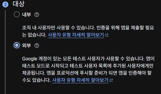 "API 및 서비스"의 "OAuth 동의 화면"으로 들어간다.