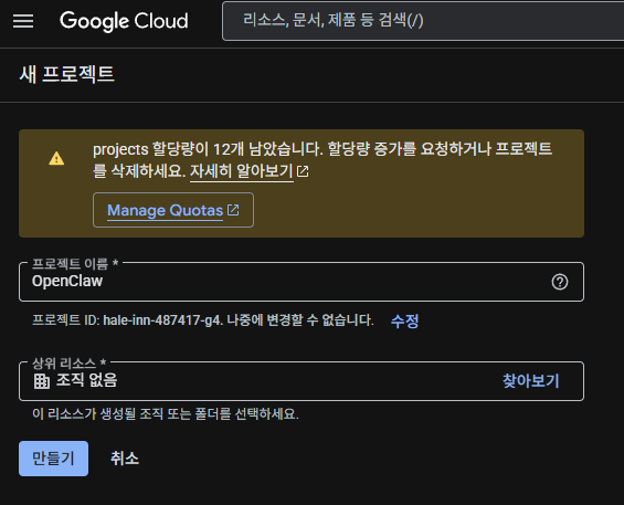 적절한 프로젝트 이름을 넣고 만들기를 누른다.