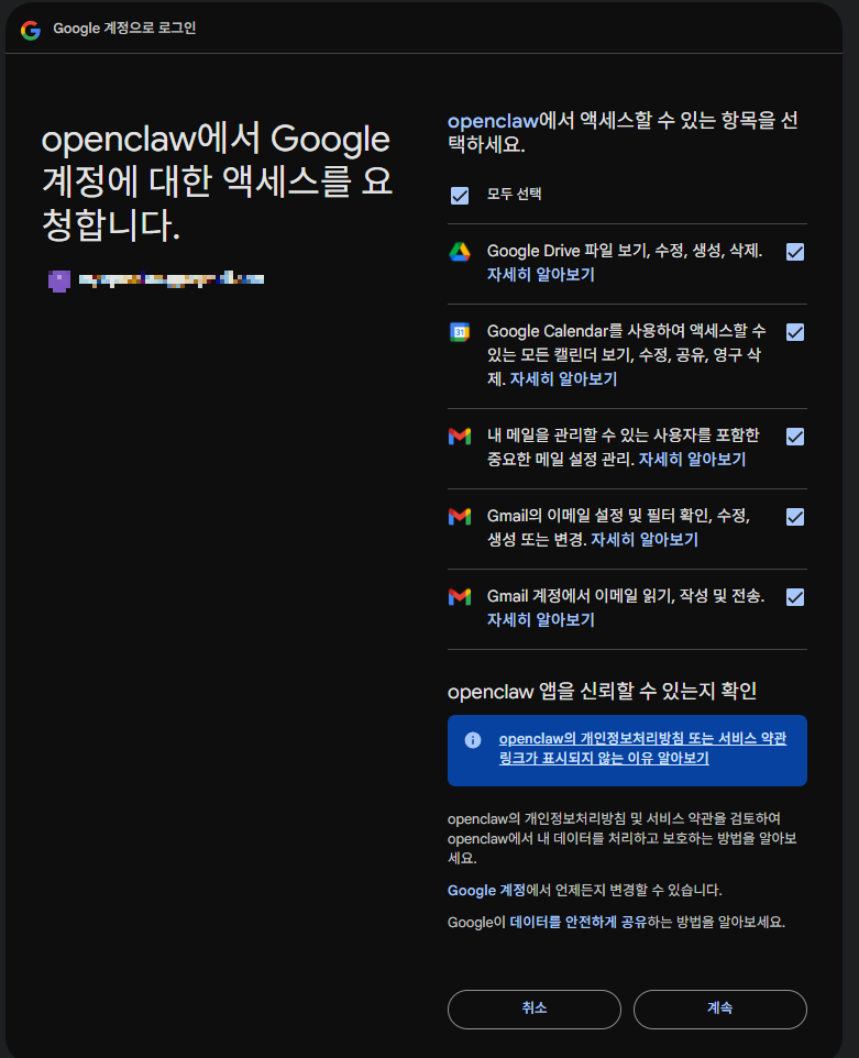 오픈클로 설치 된 환경에서 위 명령어를 실행하면 URL 하나 주는데 연동하고자 하는 구글 계정이 로그인 된 브라우저에서 열어야 한다.